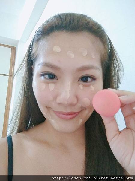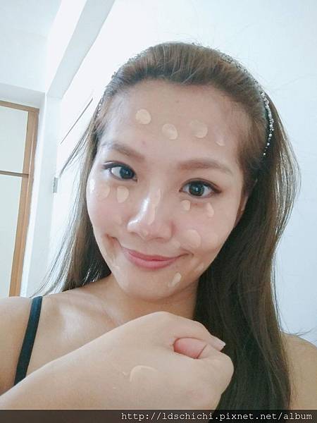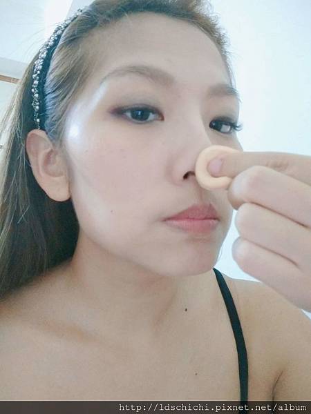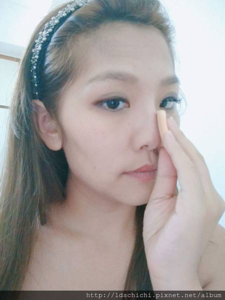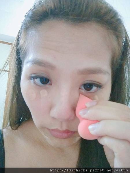 黑眼圈用尖的部分把漾緁 輕妝綺肌長效粉底液一升級版推勻