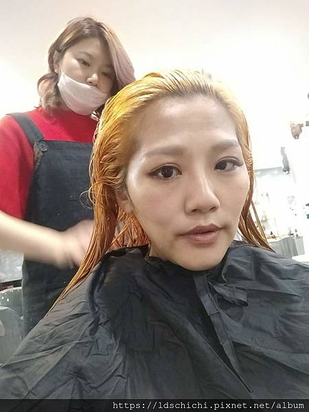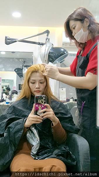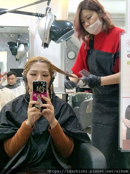 助理一邊幫我上頭皮隔離MOMO一邊準備退色的東西~