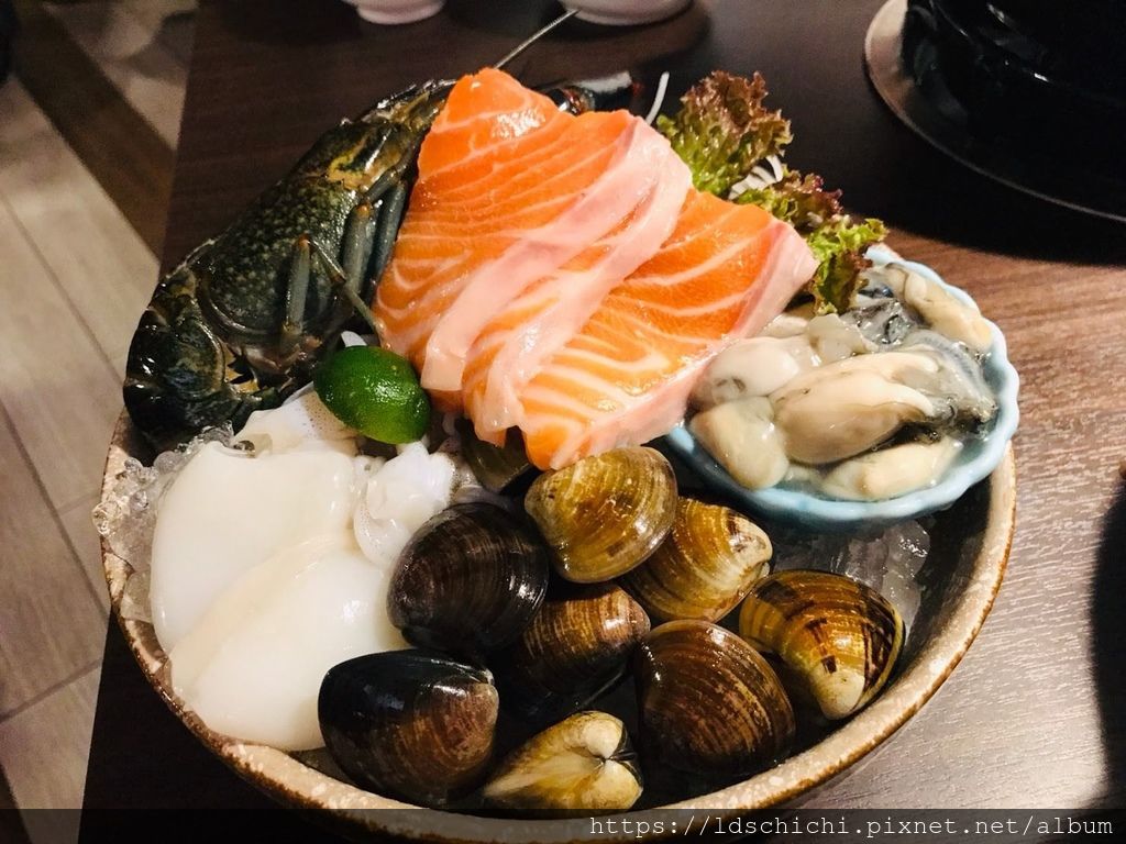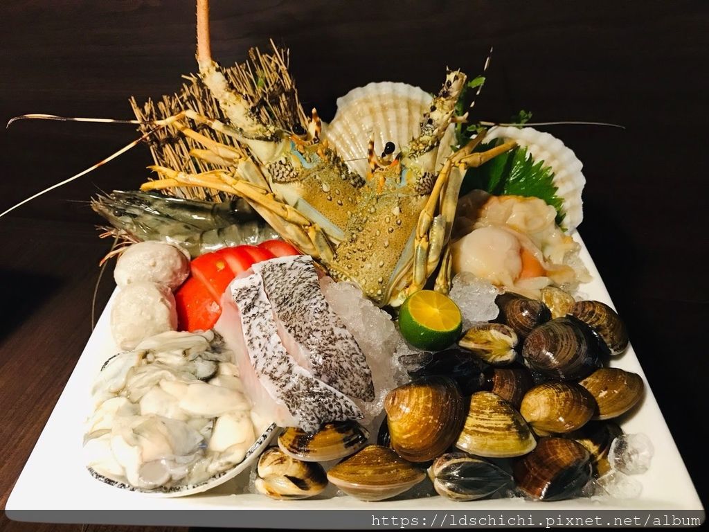 點鍋類的綜合海鮮盤(有蛤蠣/蚵仔/小花枝/鮭魚片/小螯蝦)