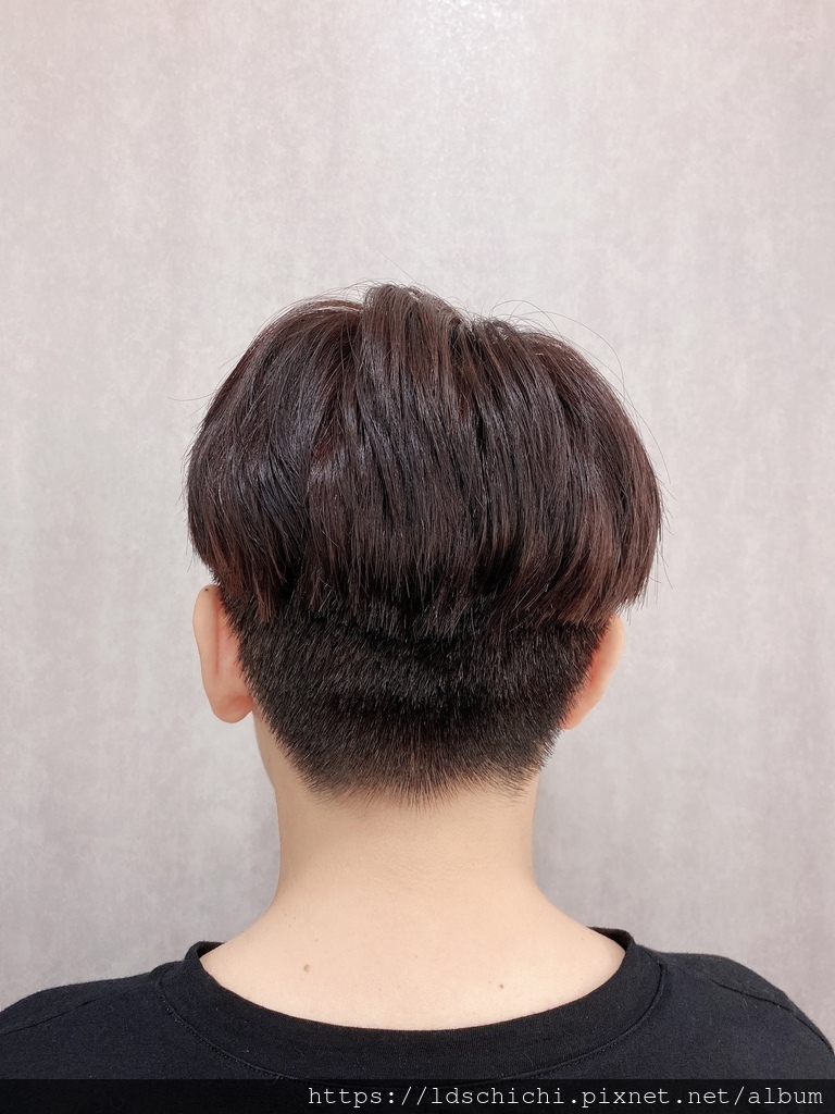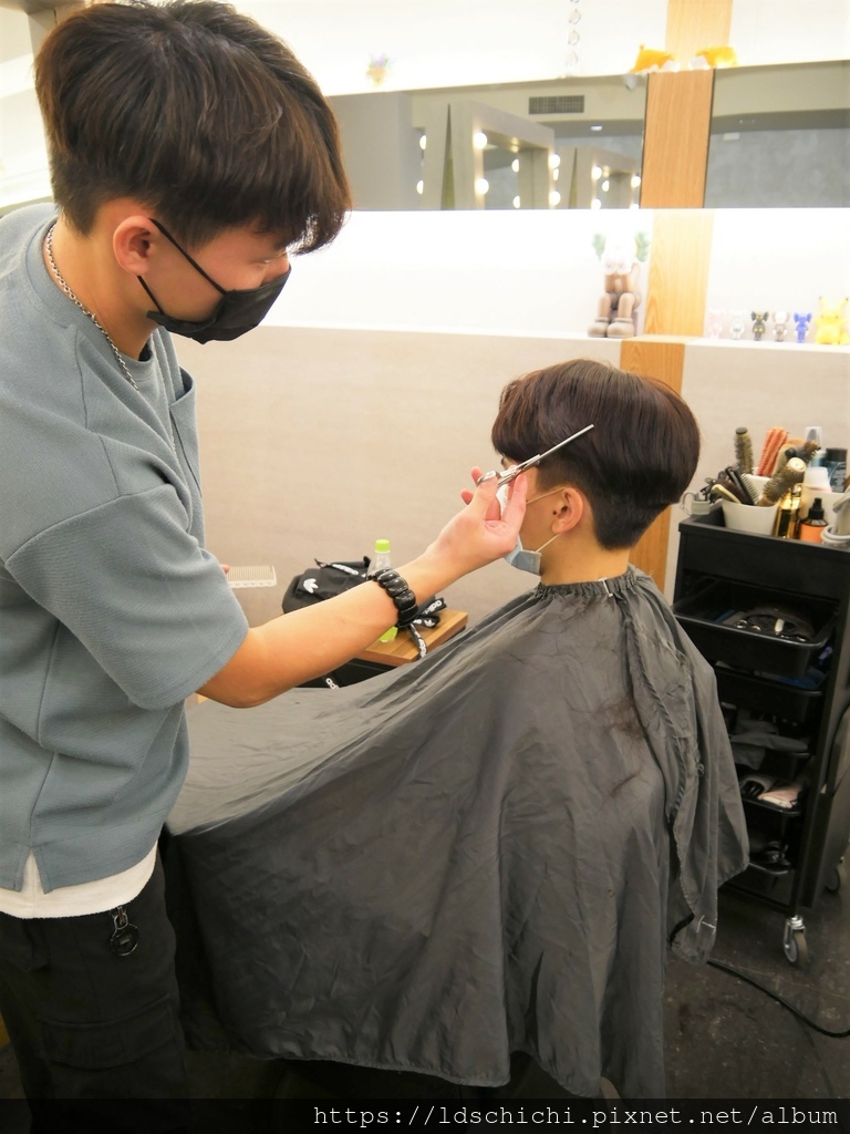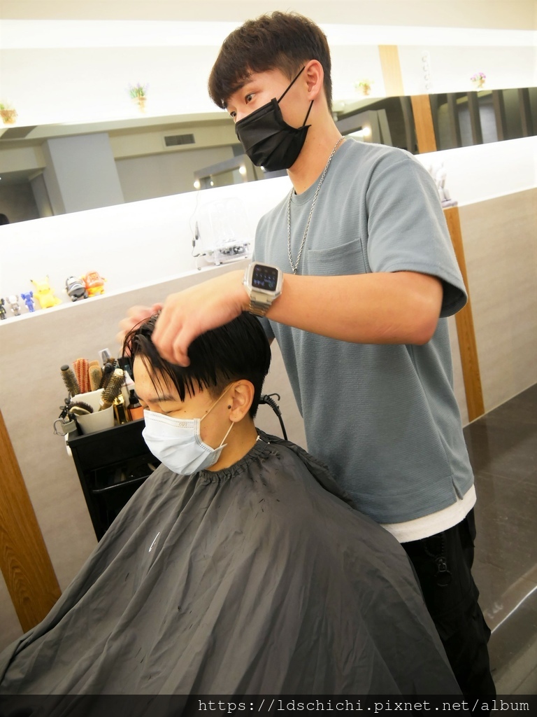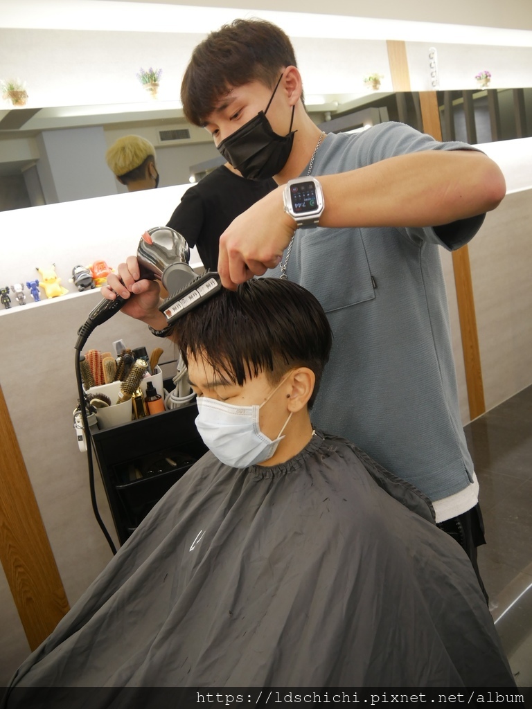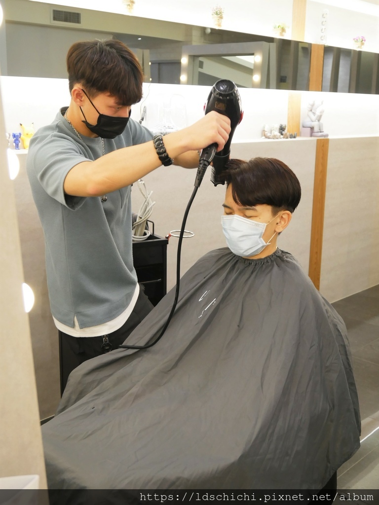 他稍微吹整一下~髮型帶點捲度